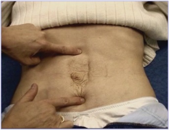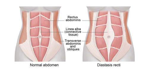 In the third trimester of pregnancy, our bellies get big – I mean, really big. Our pelvis goes through some changes in preparation for birth and our abdominal muscles have no choice but to stretch out as the belly grows. Virtually every woman with a full term pregnancy belly will experience a separation of their rectus abdominis muscles, called diastasis recti. The diastasis, or separation of the rectus abdominis muscles, occurs as the linea alba, the connective tissue between the left and right sides of your rectus abdominis, stretches under the strain of a growing belly (see illustration). A normal separation of the rectus abdominis muscles is 2 finger widths or less; anything larger is considered diastasis recti.